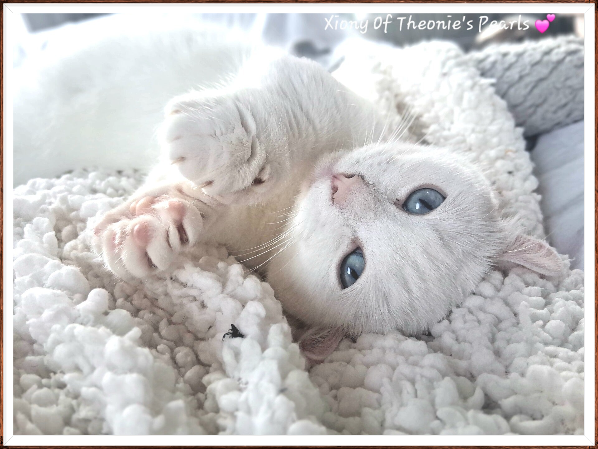 Xiony est une petite femelle jaguarundi curl, blanche aux yeux bleus clairs, polydactyle, blanche aux yeux clairs , porteuse de colourpoint, brown, black . Petite beauté extrêmement pot de colle également
